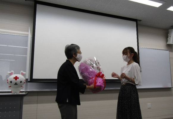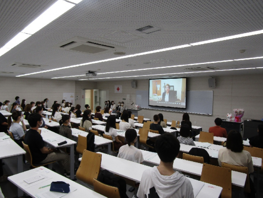 守田美奈子学長は「日本赤十字看護大学の「人道(Humanity)」の精神のもと、人と人とが尊重し合った関係を築いていく、そういった大学でありたい。」とオンラインで挨拶を述べる他、校歌斉唱、新入生への花束の贈呈などを行い、学生の笑顔が一同に揃う初めての機会となりました。
