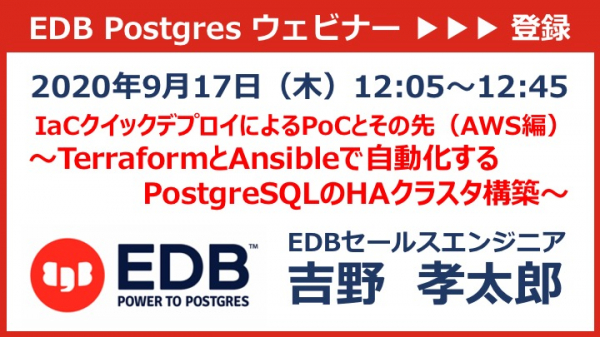 EDBは「IaCクイックデプロイによるPoCとその先〜TerraformとAnsibleで自動化するPostgreSQLのHAクラスタ構築〜」と題するウェビナーを9月17日(木)に開催いたします。