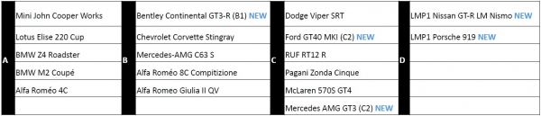 ギア・クラブ アンリミテッド2収録車の中から13台がサーキット仕様で登場。『耐久選手権』のために追加された新車は5台。うちLMPを冠するカテゴリDの2車種はル・マン24時間の参加車両として独自に規定された競技専用車「ル・マン プロトタイプ」となっている。