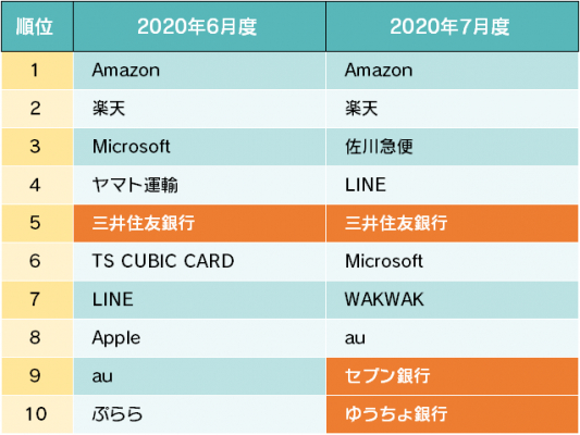 詐欺ウォールで収集したフィッシング詐欺サイトで盗用されていたブランドの上位10件は以下のようになっています。7月は金融機関が3社ランクインしています。