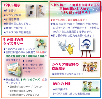 プロジェクト2年目に当たる今年は、平和の祈りを折り鶴に込めて制作する「折り鶴アート」プロジェクトなどを実施します。8月29日(土)より、市民のみならず、全国から「折り鶴」を募集し、集まった折り鶴で「舞鶴引き揚げの日」のロゴマークを制作。「舞鶴引き揚げの日」10月7日に披露させて頂きます。また、募集を開始する8月29日には、東舞鶴駅前の商業施設「ショッピングセンターらぽーる」でPRイベントも開催します。詳細は以下の通り。