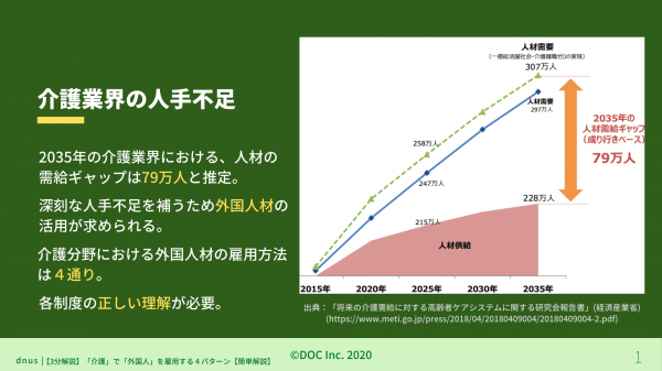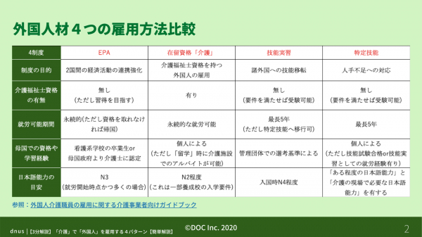 外国人採用支援の総合ポータルサイトdnus(ディヌス)を提供するDOC株式会社(本社:東京都千代田区/代表取締役:廣瀬義憲)は【3分解説】「介護」で「外国人」を雇用する4パターンに関するまとめレポート( https://bit.ly/32zDqEz )を令和2年8月28日に公開いたしました。