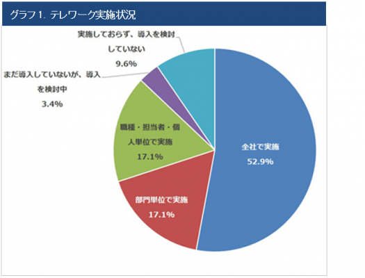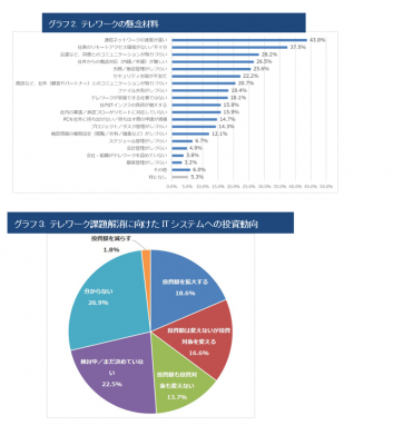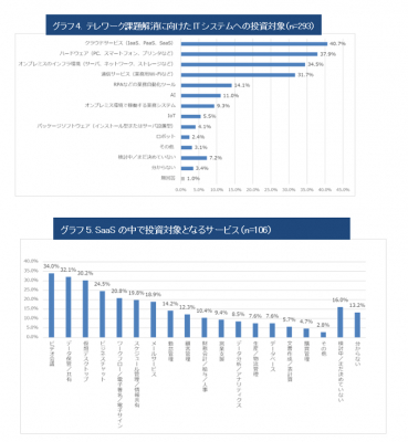 回答者のうち87%がテレワークを導入しています。テレワーク導入に伴う懸念点としては、「通信ネットワークの速度が遅い」、「社員のリモートアクセス環境が不十分」など基本的なインフラについての課題が多くなっていますが、それらに続いて「コミュニケーションが取りづらい」、「電話対応が難しい」、「労務/勤怠管理がしづらい」など、テレワークに移行した後の業務上の不満が挙げられています。こうした課題に対し、35.2%はIT投資によって積極的に解決を図ろうとしており(「ITシステムへの投資額を拡大する」または「投資対象を変える」)、そのための投資対象として第一に「クラウドサービス」を挙げています。