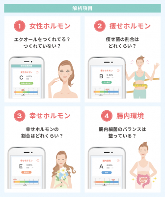 女性の美容・更年期障害のお悩みに直結する「女性ホルモン菌」、痩せ体質の人に多いとされる「痩せホルモン菌」、幸せホルモンのもとである「幸せホルモン菌」、そして腸内フローラの基本となる「腸内環境(多様性)」の4つの項目を解析します。