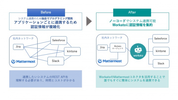 今までクラウドサービスと自社サーバーで管理するオンプレミスツールの連携は、それぞれ連携する必要がありました。さらにシステムのREST APIを理解する必要があったため、認証情報が複雑化し、連携までに時間とコストがかかっていました。リックソフトは業務自動化ツール『Workato(ワーカート)』の特徴のひとつであるオンプレミスツールとの連携機能を活用し、システム連携を簡単にしたいと思い、リックソフトが扱っているオンプレミスチャットツール『Mattermost』をハブにしたシステム同士をノーコードで連携できる『Mattermost コネクタ』を開発しました。