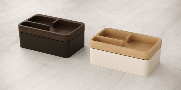 Revov Tray Boxは、一見してシンプルなデザインのデスクオーガナイザー。その特徴は上部トレーの開閉方法にあります。