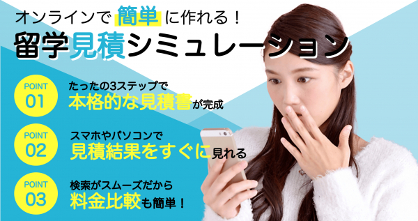 上記の情報により留学費用の相場を知るだけでなく、留学全体に必要な金額も同時に確認いただくことが可能です。オンラインで作成いただいた見積書をもとに学校の選び方やお申し込み方法について弊社留学カウンセラーにご相談いただくことが可能です。