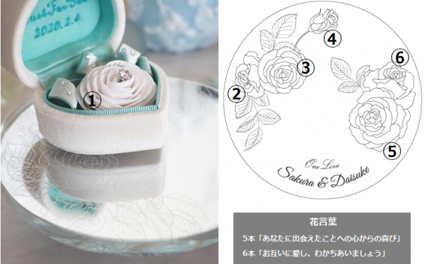 新商品「クリスタルミラースタンド(上図)」には、“あなたに出会えたことの心からの喜び”という花言葉を持つ5本のバラをレーザ彫刻にてデザインしています。“箱パカプロポーズ”を実現できるプロポーズボックスのバラと合わせると合計6輪となり、バラ6本の花言葉「お互いに愛し、分かち合いましょう」という熱い想いを彼女に伝えることができます。バラの本数に隠された「花言葉」で、あなたと彼女の特別なプロポーズの瞬間を彩ります。