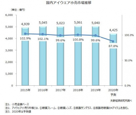 【矢野経済研究所プレスリリース】国内アイウエア小売市場に関する調査を実施(2020年) 2019年の国内アイウエア小売市場は、機能性アイウエアの需要に一服感、前年比99.6%の5,040億円と微減推移