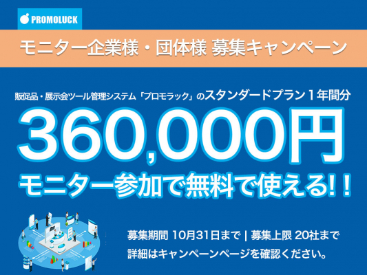 【早い者勝ち】 360,000円分が無料!販促品・展示会ツールの運用管理にお困りの企業様へ|プロモラックのモニターを募集しています! (20/9/29~20/10/31)