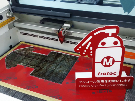 トロテックは、本イベント用に二層板を使い、当社レーザーカッターで手指消毒の案内ディスプレイを製作しました。ぜひ会場で実物をご覧ください。