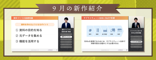 教育×クリエイティブ×テクノロジーにより課題を解決するミテモ株式会社(本社:東京都中央区、代表取締役:澤田哲也、以下「ミテモ」)は、eラーニング映像教材9月度の新作として「資料づくりの基礎知識講座」と「これからのビジネスにおけるSDGs経営講座」の提供を開始しましたのでお知らせいたします。