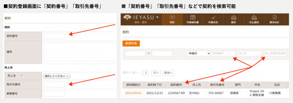 1)契約登録画面に「契約番号」「取引先番号」などを追加、検索も可能に。