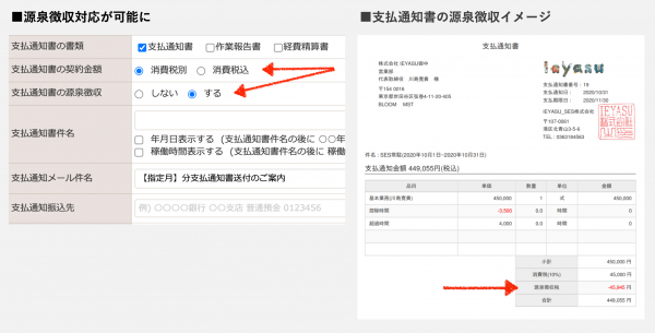 その中でデザイナーなど「源泉徴収」が必要な場合、こちらの設定により源泉徴収対応が可能になります。