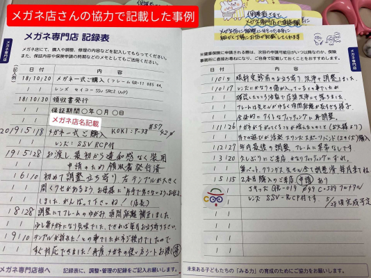 しかし「みるみる手帳」は多くの医療情報を含み保護者の混乱を防止するため、賛同し活用する眼科医療機関以外での流通は一切しておりません。現在、各地の眼科で交付された保護者がメガネ専門店に来店の際、記載方法の周知が徹底出来ていない事が課題となっています。
