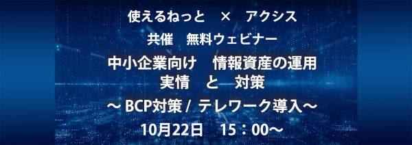使えるねっと株式会社(本社:長野県長野市、代表取締役:ジェイソン・フリッシュ)は、株式会社アクシス(本社:栃木県宇都宮市、代表取締役社長: 和氣 悟志)と共同で10月22日、中小企業様向けに情報資産の運用管理方法、BCP対策とテレワーク導入についてオンラインウェビナーを開催します。