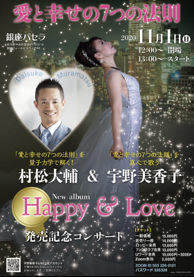 世界を愛と幸せと祝福の波動に包むため「愛と幸せの7つの法則」を広く伝える「Happy&Love Project」を展開している伝説のアイドル「宇野美香子」が量子力学の権威「村松大輔」をスペシャルゲストに迎えて開催する特別なイベントです。