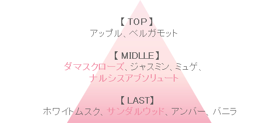 ローズとムスクのアコードを基調とした清楚な香りに、サンダルウッドとナルシスアブソリュートを加えることで、女性らしい優しさと温もりを演出。