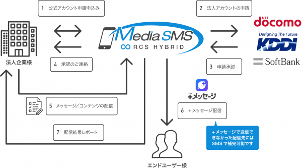 「Media SMS ∞ RCS HYBRID」は、株式会社メディア4uが提供する、法人向け「+メッセージ」配信サービスです。RCS(リッチコミュニケーションサービス)は、携帯電話においてSMSに続く新たなコミュニケーションツールとして注目されているメッセージング・プロトコルの一種であり、日本では2018年5月よりドコモ、au、ソフトバンクの大手3キャリアが「+メッセージ」として提供をスタートさせております。