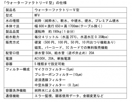 ウォーターポイント株式会社(本社:広島市、代表取締役社長:小早川克史)は、全国のスーパーマーケット等に2,000台以上の納品実績がある水の自動販売機「ウォーターファクトリー(WF)」の最新型「V型シリーズ」を開発しました。
