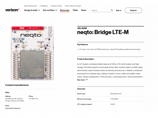 2020年10月22日(現地時間) - IoTエンジンライセンス及びクラウドソリューションのリーディング企業、JIG-SAW INC.(東京都千代田区)の米国法人JIG-SAW US, INC.(米国サンフランシスコ、以下JIG-SAW US)は、IoTエンジン搭載「neqto: Bridge LTE-M」エンタープライズレベルのIoTキットがVerizon Communications Inc.(米ニューヨーク、以下Verizon)のOpen Device(OD)認証を正式に取得したと発表し、これにより、Verizonの全米4G LTEネットワークにおいて、JIG-SAWのneqto: Bridge LTE-Mが利用可能となりました。