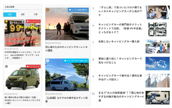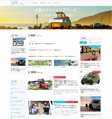 キャンピングカー株式会社では、日本で最大級のキャンピングカーレンタルサービス「ジャパンキャンピングカーレンタルセンター」を運営しています。そのノウハウを活かし、キャンピングカーをはじめてレンタルする利用者向けのお役立ちコンテンツ集など、実際にキャンピングカーレンタルを行ってきた事業者だからこそ発信できるコンテンツを拡充しています。