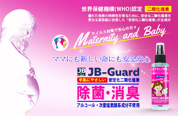 人肌にやさしい『JB-GUARDマタニティ&ベィビー』は、妊産婦さんやお子様にも、また高齢者の方にも安全でWHO (世界保健機関)認定の二酸化塩素が主成分です。JB-GUARD全ての商品は、世界が安全性を認める二酸化塩素を、より長時間の効能を維持するように改良した安定化二酸化塩素を採用しています。