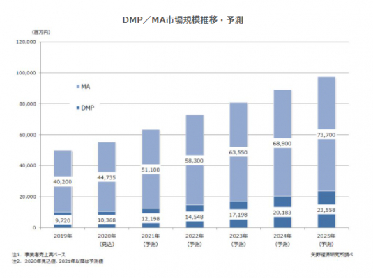 DMP/MA市場は今後も拡大傾向が続き、2025年はDMP市場(事業者売上高ベース)が235億5,800万円、同じくMA市場は737億円に成長すると予測する。