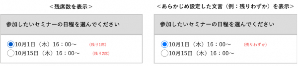 なお、「残りわずか」等の文言は「受付数に対する残数の割合が何%以下になったら表示するか」をあらかじめ設定できます。