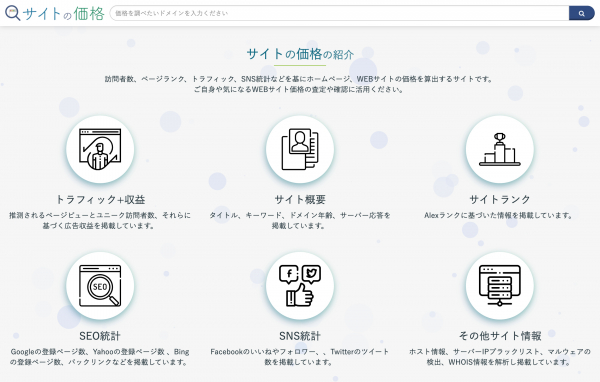 訪問者数、ページランク、トラフィック、SNS統計などを基にサイトの価格を推定。