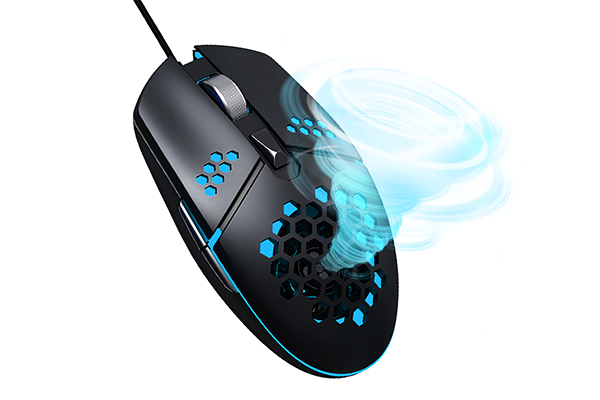 本製品は、中空ハニカム構造のマウス本体に送風ファンを内蔵しており、本体上部から心地よい風を吹き出します。マウスを握る手のひらに風を当てることで、手汗などによる不快感をすっきりさせることができます。送風ファンは本体底面のスイッチでオフにすることもできます。
