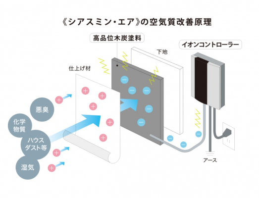 《シアスミン・エア》は、高品位木炭塗料を天井や壁の下地に塗布し、イオンコントローラーによって微弱電流を流して、塗布面をマイナス帯電化。さまざまな化学物質やニオイを吸着・分解し、調湿も行いながら室内のプラスイオンを引き寄せてマイナスイオンの割合を高める内装システムです。