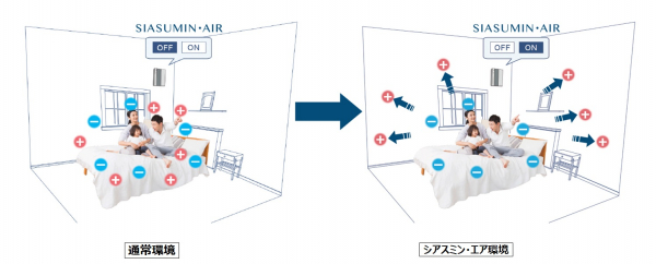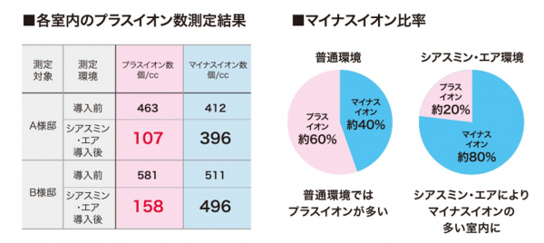 《シアスミン・エア》導入前後で室内空気中のプラスイオン数とマイナスイオン数の変化を測定した結果、導入後はマイナスイオン数をほぼ維持しながら、プラスイオン数が大幅に減少。プラスイオン約20%に対して、マイナスイオンが約80%を占める室内環境となることが実験で確かめられています。