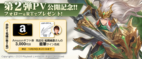 公式Twitterアカウントをフォローし、対象のキャンペーンツイートをリツイートいただいた方から抽選で各2名様(計4名様)に『馬超』役の松岡禎丞さんによる、直筆サイン色紙またはAmazon.co.jpギフトカード3000円分をプレゼントいたします。