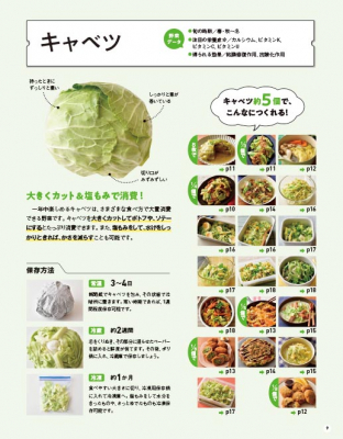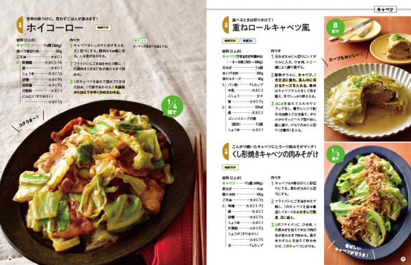 たとえばキャベツ1個で20種類のレシピがあり、主菜や副菜だけで使い切ってもいいし、