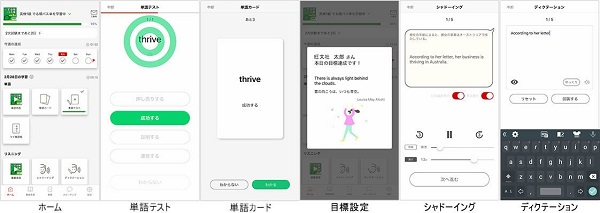 単語リスニング機能に、書籍掲載英単語の日本語訳音声と英語例文音声のコンテンツが追加されます。再生パターンや再生設定を詳細にカスタマイズすることが可能で、自分に合ったリスニング学習を実現できます。その他、「音声を聴いて答える」単語テストやフラッシュカード、自分の学習状況を反映した「マイ単語帳」など、単語暗記から記憶定着までを豊富な機能でサポートします。