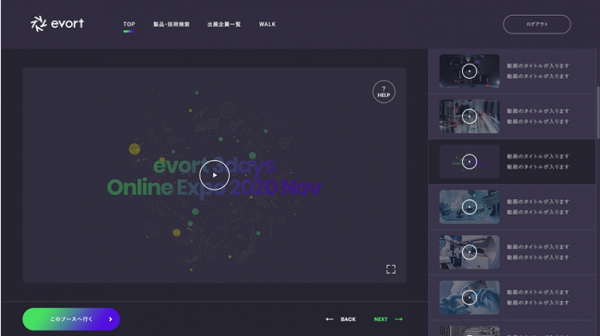 現存するオンラインサービスの導線の主流は「検索」です。「検索」できることは来場者自身のニーズが顕在化しているものだけです。通常の展示会では例え明確な目的がなくても会場内を見て歩き、思わぬ発?・ふと気になったブースに入ります。そのような行動と同じように【 evort work】では、サイト内で流れる15秒のCMを見てもらい、気になったブースを選択いただきます。まるで展示会場を見て歩く時のような「ここでしかない出会い」をオンラインならではのやり方で実現。