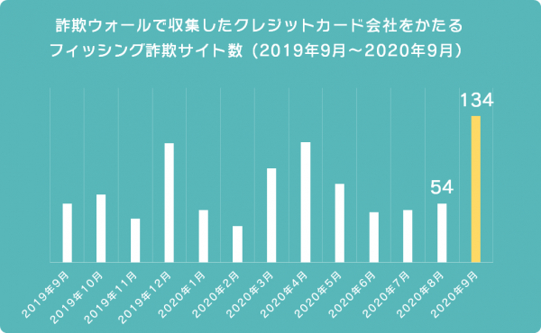 過去1年間に詐欺ウォールで調査として収集しているクレジットカード会社をかたるフィッシング詐欺サイト数は、以下グラフのようになっており、2020年9月は134件と過去1年間で最も多い件数となっています。