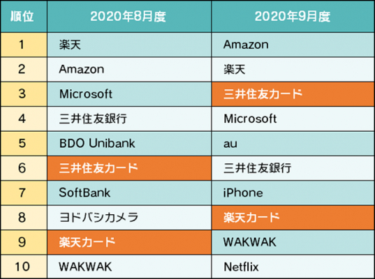 詐欺ウォールで収集したフィッシング詐欺サイトで盗用されていたブランドの上位10件は以下のようになっており、8月に引き続きクレジットカード会社が2社ランクインしています。