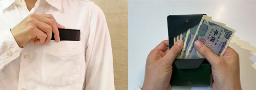 コンパクトさの秘密は、極力仕切りを減らし、コインとカードの収納の境を自由にさせたこと。一般的な二つ折り財布とほぼ変わらない収納力をもち、かつワイシャツの胸ポケットにも収まるほどミニマムな作りで、スマートな生活を好む男性を中心に支持が急上昇しています。