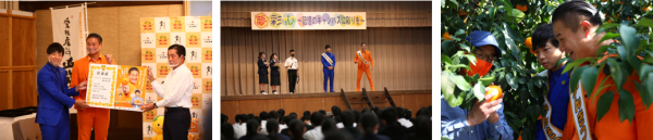 正式に、「愛媛かんきつ部」のキャプテンと部長となったお二人は、愛媛県に近く、二人が高校野球で汗を流した母校・済美高校が、学園祭中であることを知り急行。生徒たちに向けて、就任を報告しながら、済美高校あるあるネタを披露。総勢600名の3年生は、このサプライズ出演に驚きながら、笑いと感動に包まれながら、大きな盛り上がりをみせました。