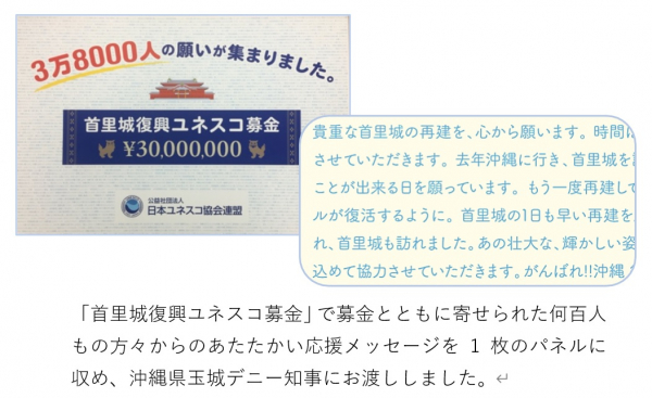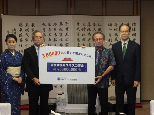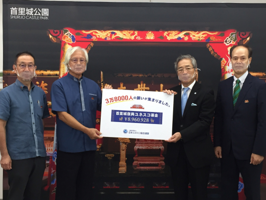 日本ユネスコ協会連盟は、2019年10月31日の火災により焼失した首里城(※1)の復興支援に向け、翌日の2019年11月1日〜2020年10月31日までの期間「首里城復興ユネスコ募金」を設置し、募金を受け付けました。本募金では、Yahoo!ネット募金も実施し、多くの皆さまにご協力いただきました。寄付総額は10月23日時点で3896万926円、その全額を沖縄県および一般財団法人沖縄美ら島財団に贈呈します。(※2)