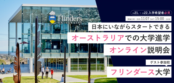 大学別説明会の第八弾である11/23のフリンダース大学説明会では大学の特徴や人気の学部などはもちろん、コロナ禍での取り組みや日本からの受講方法などを大学スタッフから直接お話いただきます。ZOOMを利用したオンラインでの説明会となっておりますので、全国どこからでもご参加いただけます。2021年春以降の海外大学進学をご検討中の方は、ぜひご参加ください。