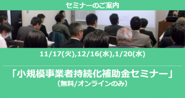 「小規模事業者持続化補助金セミナー(無料/オンライン)」11/17(火),12/16(水),1/20(水)開催のお知らせ