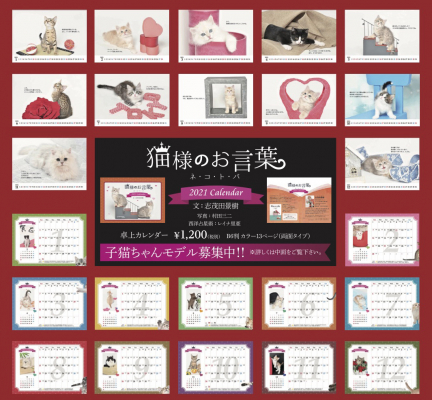 『猫様のお言葉 ネ・コ・ト・バ2021卓上カレンダー』は、志茂田景樹氏の心に響く名言×かわいい子猫写真集。星占い、隠れニャンコも登場で、使って楽しく癒やされるカレンダーとして今年も販売スタート!