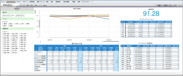 2つ目のダッシュボード「評価レポート」は、顧客からの「お褒めの言葉」や「無事故継続走行距離」をプラス評価、不安全データや事故などをマイナス評価として、独自の計算方式でポイント化したものを、個人別・チーム別に可視化したものです。「不安全データマップ」と同様に、運行後の振り返りにおいて運転士と確認することで、運転士の技術や不安全運転の削減に向けた安全意識の向上に役立てています。