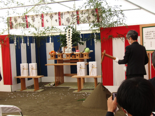 神事には小宮敬子さいたま看護学部長をはじめとした日本赤十字看護大学関係者、設計監理者である株式会社横河建築設計事務所、施工者である清水建設株式会社などが列席し、鍬入之儀、玉串奉奠などが厳粛に執り行われました。