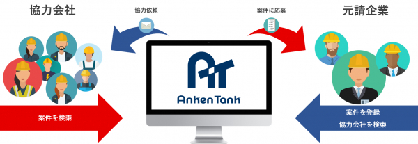 そこで公共工事に、取り組みやすい体制整備、スムーズな受発注をサポートするべく、公共工事案件専門のマッチングサイト「案件タンク」を提供するに至りました。
