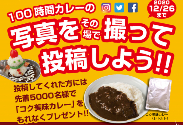 新型コロナウィルス感染拡大で、飲食業界に甚大な被害が起きている中の店舗拡大は、ひとえに皆様のご愛顧とご支援によるものと深く感謝しております。日頃の感謝を込めて『100時間カレー』直営9店舗、期間限定で『100時間カレー』をお召し上がりいただき、メニュー画像をSNSに投稿してくれた方に、100時間カレー監修の「コク美味カレー(レトルト)」を先着5,000名様にもれなく1個プレゼントいたします。