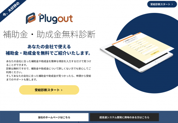 大分県別府市でシステム開発業を営む株式会社プラグアウトさまが「新型コロナで窮地に陥ったお客様を助けたい」という考えのもと助成金・補助金自動診断システム「Jシステム」を導入し、2020年11月にサービス展開を開始いたしました。「Jシステム」はコロナ対策の制度をはじめ、厚生労働省や経済産業省が所管する膨大な補助金・助成金の中で、受給できる可能性が高い「制度」と「金額」をオンライン上で自動診断できるサービスとなります。大分県内の地方創生として期待を寄せられています。